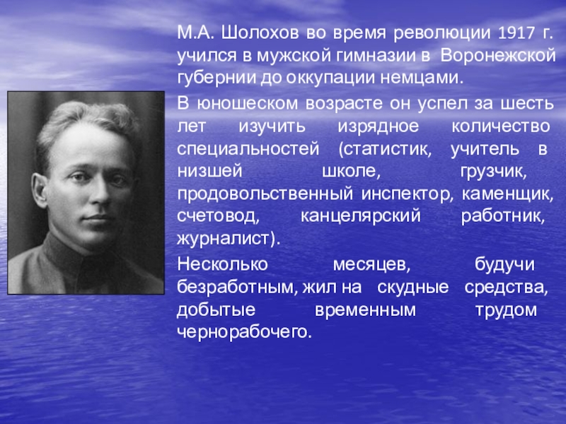 Слайд 3М.А. Шолохов во время революции 1917 г. учился в мужской гимназии