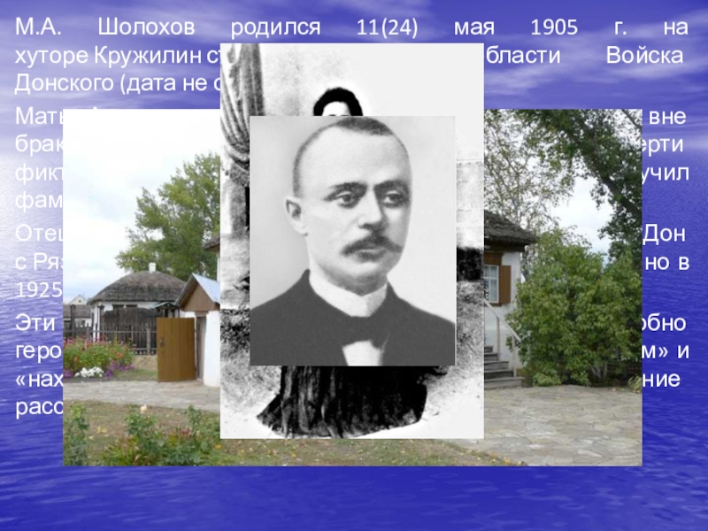 Слайд 2М.А. Шолохов родился 11(24) мая 1905 г. на хуторе Кружилин станицы Вёшенской области Войска