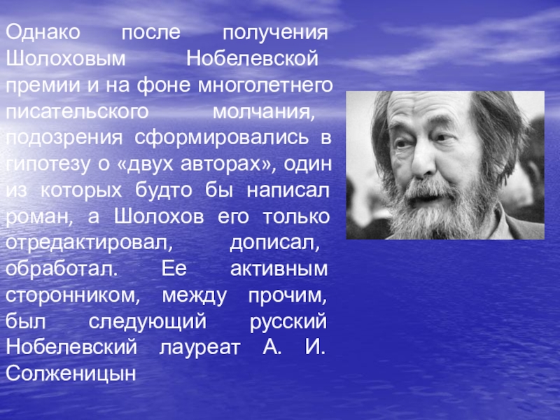 Слайд 11Однако после получения Шолоховым Нобелевской премии и на фоне многолетнего писательского
