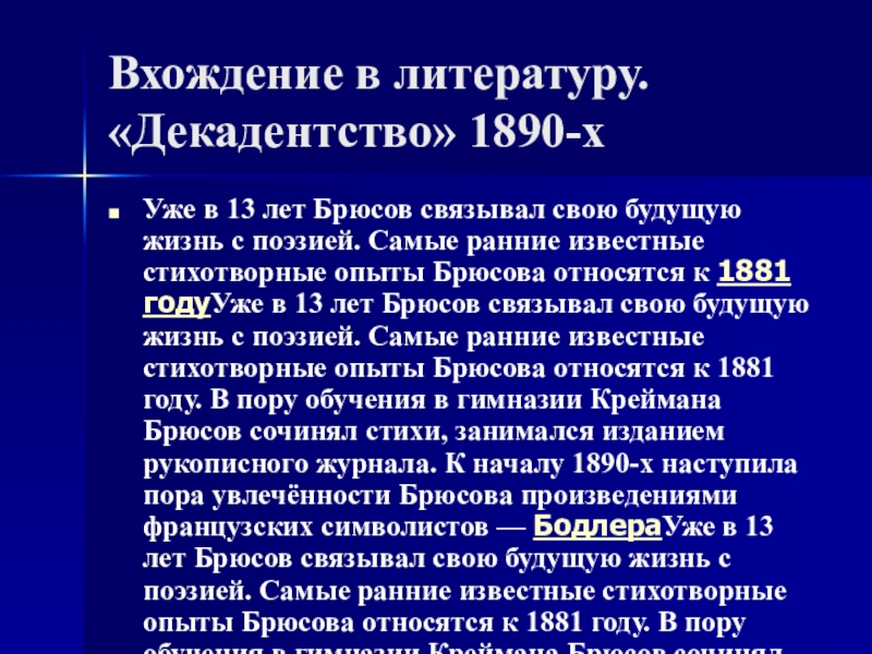 свою будущую жизнь с поэзией. Самые ранние известные стихотворные опыты Брюсова относятся к 1881 годуУже в 13 лет Брюсов связывал свою будущую жизнь с поэзией. Самые ранние известные стихотворные опыты Брюсова относятся к 1881 году. В пору обучения в гимназии Креймана Брюсов сочинял стихи, занимался изданием рукописного журнала. К началу 1890-х наступила пора увлечённости Брюсова произведениями французских символистов — БодлераУже в 13 лет Брюсов связывал свою будущую жизнь с поэзией. Самые ранние известные стихотворные опыты Брюсова относятся к 1881 году. В пору обучения в гимназии Креймана Брюсов сочинял стихи, занимался изданием рукописного журнала. К началу 1890-х наступила пора увлечённости Брюсова произведениями французских символистов — Бодлера, ВерленаУже в 13 лет Брюсов связывал свою будущую жизнь с поэзией. Самые ранние известные стихотворные опыты Брюсова относятся к 1881 году. В пору обучения в гимназии Креймана Брюсов сочинял стихи, занимался изданием рукописного журнала. К началу 1890-х наступила пора увлечённости Брюсова произведениями французских символистов — Бодлера, Верлена, МаллармеУже в 13 лет Брюсов связывал свою будущую жизнь с поэзией. Самые ранние известные стихотворные опыты Брюсова относятся к 1881 году. В пору обучения в гимназии Креймана Брюсов сочинял стихи, занимался изданием рукописного журнала. К началу 1890-х наступила пора увлечённости Брюсова произведениями французских символистов — Бодлера, Верлена, Малларме. В 1890-х годах Брюсов написал несколько статей о французских поэтах. В период с 1894Уже в 13 лет Брюсов связывал свою будущую жизнь с поэзией. Самые ранние известные стихотворные опыты Брюсова относятся к 1881 году. В пору обучения в гимназии Креймана Брюсов сочинял стихи, занимался изданием рукописного журнала. К началу 1890-х наступила пора увлечённости Брюсова произведениями французских символистов — Бодлера, Верлена, Малларме. В 1890-х годах Брюсов написал несколько статей о французских поэтах. В период с 1894 по 1895 год он издал три сборника «Русские символисты».