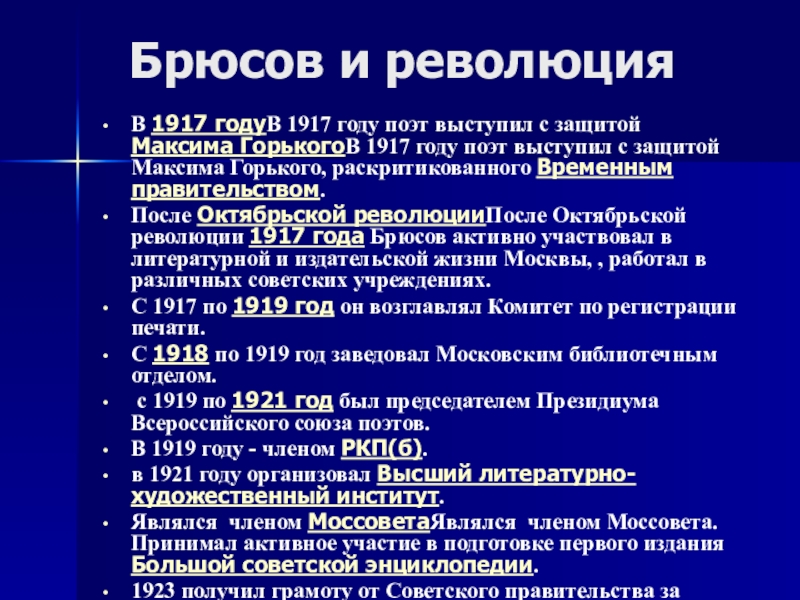 После Октябрьской революцииПосле Октябрьской революции 1917 года Брюсов активно участвовал в литературной и издательской жизни Москвы, , работал в различных советских учреждениях.