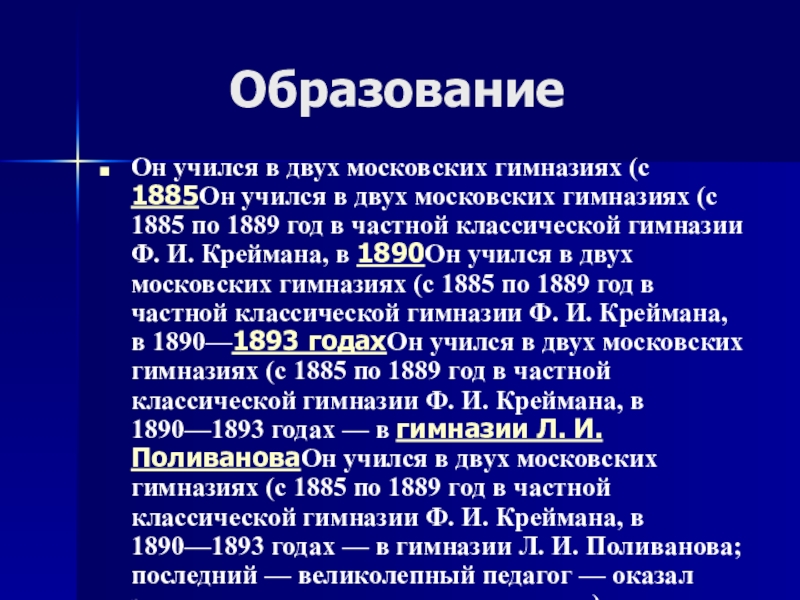 (с 1885Он учился в двух московских гимназиях (с 1885 по 1889 год в частной классической гимназии Ф. И. Креймана, в 1890Он учился в двух московских гимназиях (с 1885 по 1889 год в частной классической гимназии Ф. И. Креймана, в 1890—1893 годахОн учился в двух московских гимназиях (с 1885 по 1889 год в частной классической гимназии Ф. И. Креймана, в 1890—1893 годах — в гимназии Л. И. ПоливановаОн учился в двух московских гимназиях (с 1885 по 1889 год в частной классической гимназии Ф. И. Креймана, в 1890—1893 годах — в гимназии Л. И. Поливанова; последний — великолепный педагог — оказал значительное влияние на юного поэта); в последние гимназические годы Брюсов увлекался математикой. Окончив московскую гимназию Л. И. Поливанова, Брюсов в 1893-99 учился на историко-филологическом факультете Московского университета, сначала на отделении классической филологии, затем — на историческом (окончил с дипломом 1 степени).