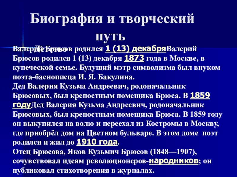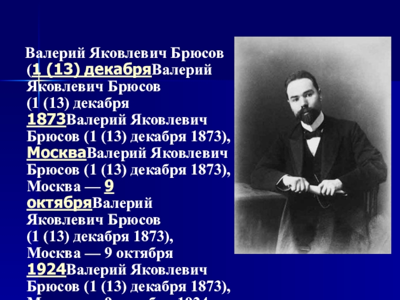 Брюсов (1 (13) декабря 1873), МоскваВалерий Яковлевич Брюсов (1 (13) декабря 1873), Москва — 9 октябряВалерий Яковлевич Брюсов (1 (13) декабря 1873), Москва — 9 октября 1924Валерий Яковлевич Брюсов (1 (13) декабря 1873), Москва — 9 октября 1924, МоскваВалерий Яковлевич Брюсов (1 (13) декабря 1873), Москва — 9 октября 1924, Москва) — русскийВалерий Яковлевич Брюсов (1 (13) декабря 1873), Москва — 9 октября 1924, Москва) — русский поэтВалерий Яковлевич Брюсов (1 (13) декабря 1873), Москва — 9 октября 1924, Москва) — русский поэт, прозаикВалерий Яковлевич Брюсов (1 (13) декабря 1873), Москва — 9 октября 1924, Москва) — русский поэт, прозаик, драматургВалерий Яковлевич Брюсов (1 (13) декабря 1873), Москва — 9 октября 1924, Москва) — русский поэт, прозаик, драматург, переводчикВалерий Яковлевич Брюсов (1 (13) декабря 1873), Москва — 9 октября 1924, Москва) — русский поэт, прозаик, драматург, переводчик, литературоведВалерий Яковлевич Брюсов (1 (13) декабря 1873), Москва — 9 октября 1924, Москва) — русский поэт, прозаик, драматург, переводчик, литературовед, литературный критикВалерий Яковлевич Брюсов (1 (13) декабря 1873), Москва — 9 октября 1924, Москва) — русский поэт, прозаик, драматург, переводчик, литературовед, литературный критик и историк.