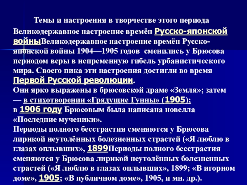 Русско-японской войныВеликодержавное настроение времён Русско-японской войны 1904—1905 годов сменились у Брюсова периодом веры в непременную гибель урбанистического мира. Своего пика эти настроения достигли во время Первой Русской революции.