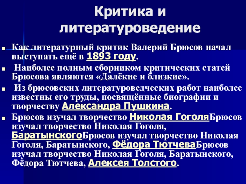 Брюсов изучал творчество Николая ГоголяБрюсов изучал творчество Николая Гоголя, БаратынскогоБрюсов изучал творчество Николая Гоголя, Баратынского, Фёдора ТютчеваБрюсов изучал творчество Николая Гоголя, Баратынского, Фёдора Тютчева, Алексея Толстого.
