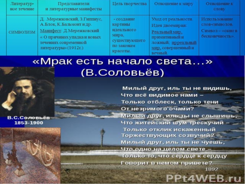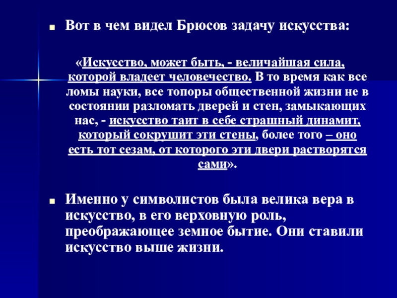 Именно у символистов была велика вера в искусство, в его верховную роль, преображающее земное бытие. Они ставили искусство выше жизни.