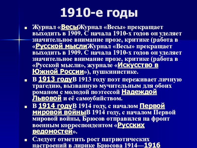 выходить в 1909. С начала 1910-х годов он уделяет значительное внимание прозе, критике (работа в «Русской мыслиЖурнал «Весы» прекращает выходить в 1909. С начала 1910-х годов он уделяет значительное внимание прозе, критике (работа в «Русской мысли», журнале «Искусство в Южной России»), пушкинистике.