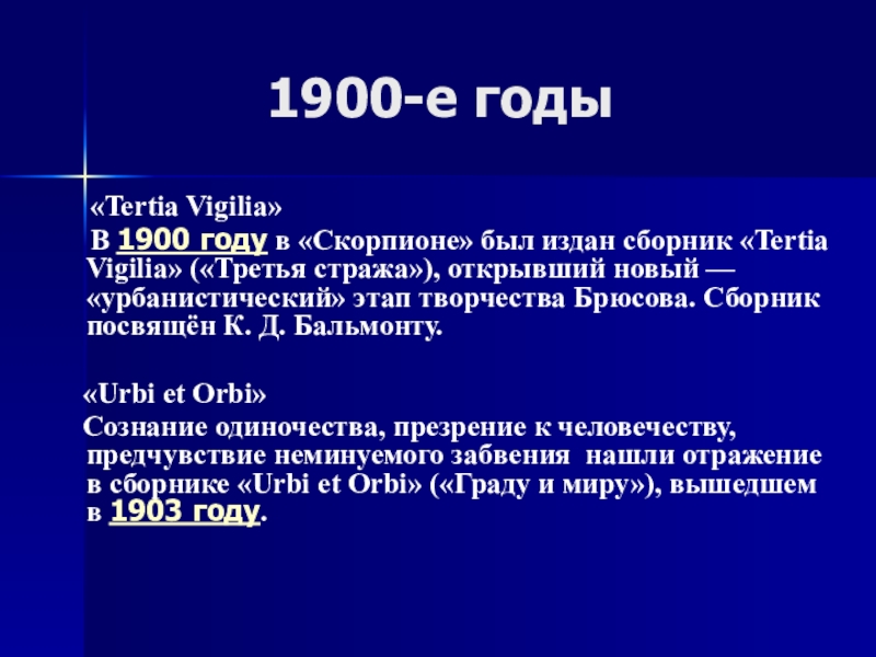 В 1900 году в «Скорпионе» был издан сборник «Tertia Vigilia» («Третья стража»), открывший новый — «урбанистический» этап творчества Брюсова. Сборник посвящён К. Д. Бальмонту.