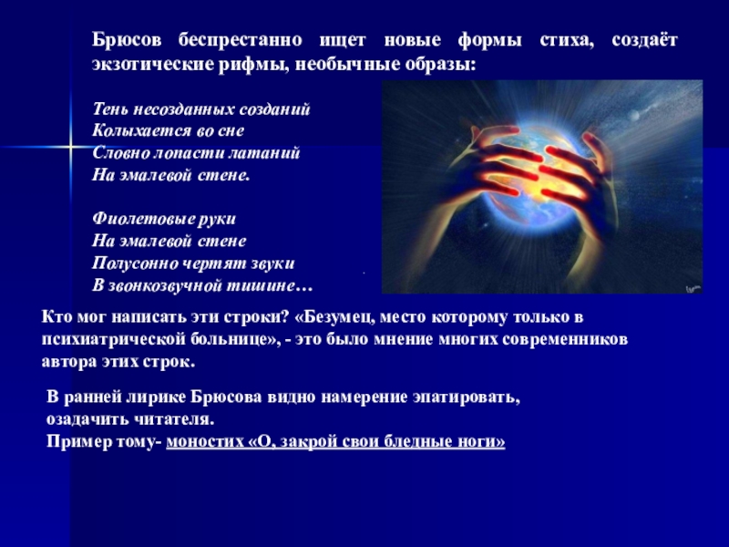Слайд 6Брюсов беспрестанно ищет новые формы стиха, создаёт экзотические рифмы, необычные образы: