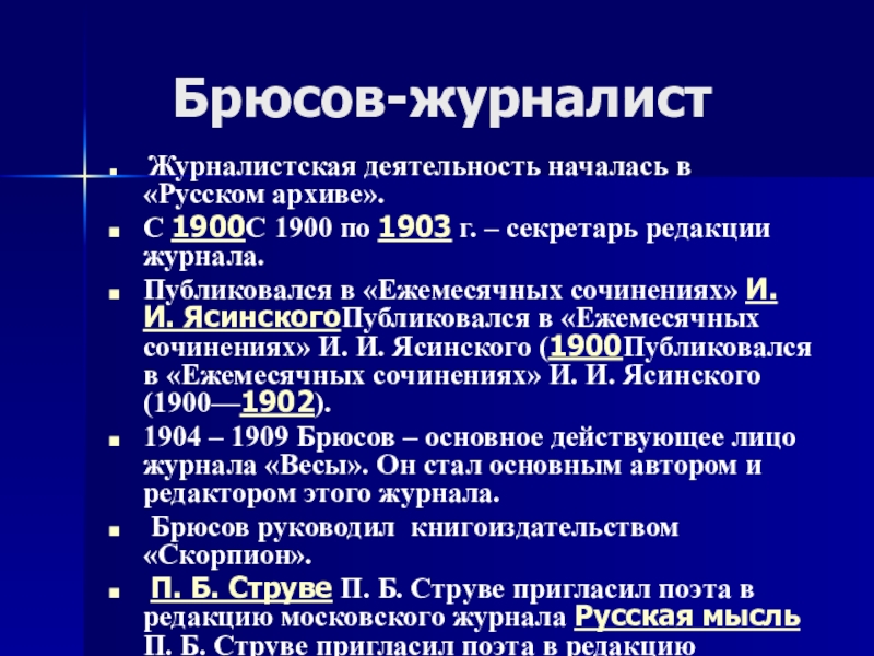 1904 – 1909 Брюсов – основное действующее лицо журнала «Весы». Он стал основным автором и редактором этого журнала.