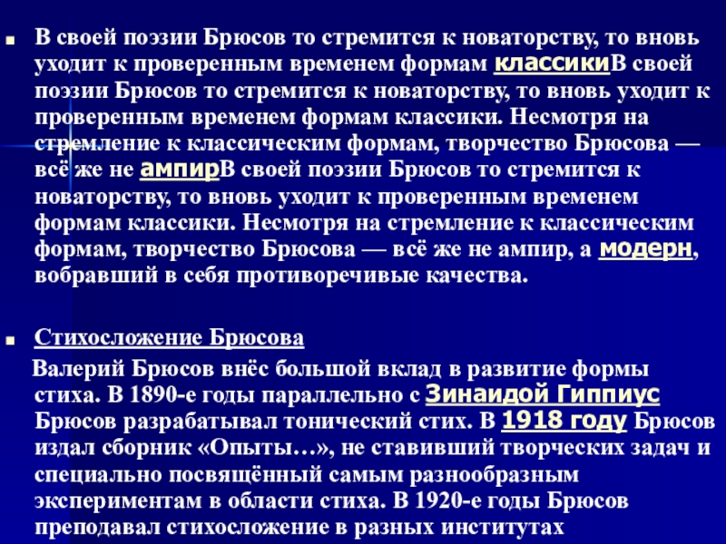 к проверенным временем формам классикиВ своей поэзии Брюсов то стремится к новаторству, то вновь уходит к проверенным временем формам классики. Несмотря на стремление к классическим формам, творчество Брюсова — всё же не ампирВ своей поэзии Брюсов то стремится к новаторству, то вновь уходит к проверенным временем формам классики. Несмотря на стремление к классическим формам, творчество Брюсова — всё же не ампир, а модерн, вобравший в себя противоречивые качества.