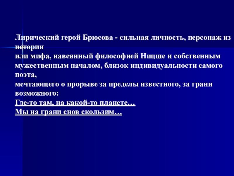 Слайд 33Лирический герой В.Брюсова - сильная личность, персонаж из истории или мифа,