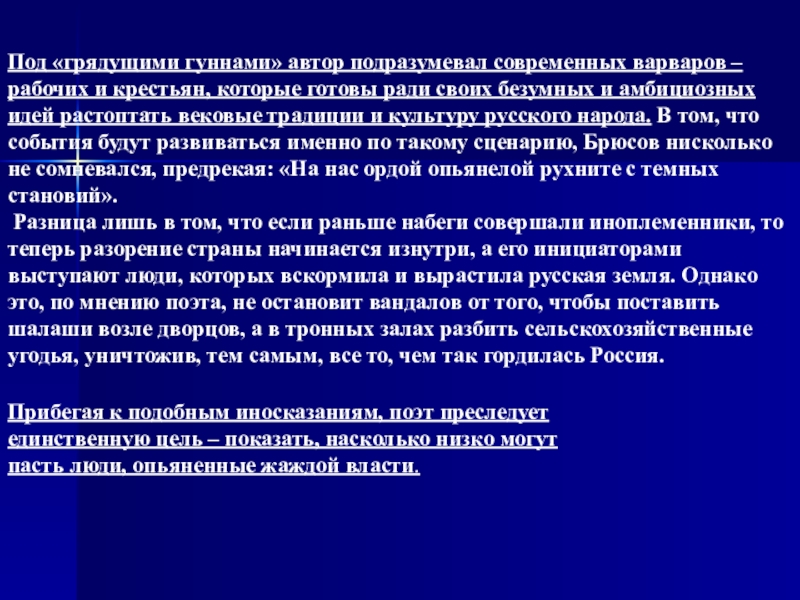 Слайд 22Под «грядущими гуннами» автор подразумевал современных варваров – рабочих и крестьян,