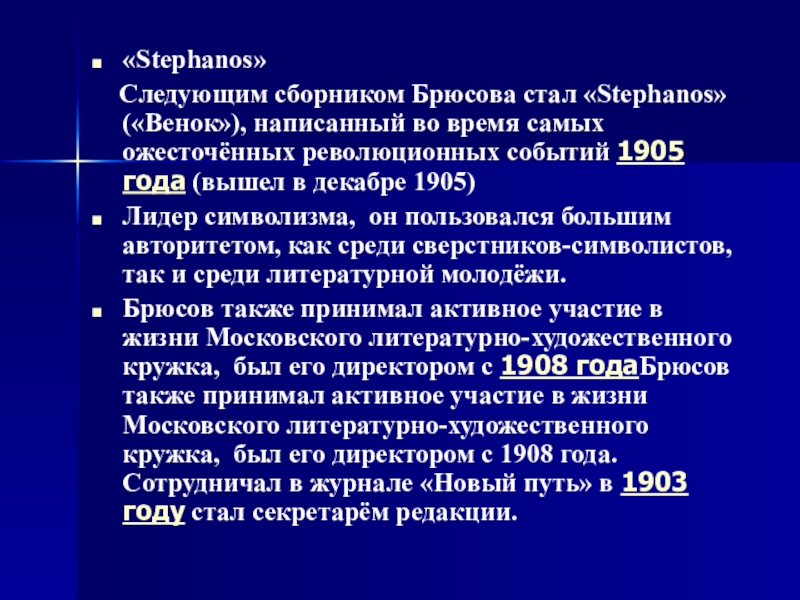 Следующим сборником Брюсова стал «Stephanos» («Венок»), написанный во время