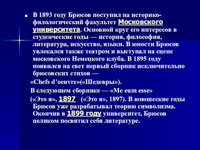 («Это я», 1897 («Это я», 1897). В юношеские годы Брюсов уже разрабатывал теорию символизма. Окончив в 1899 году университет, Брюсов целиком посвятил себя литературе.