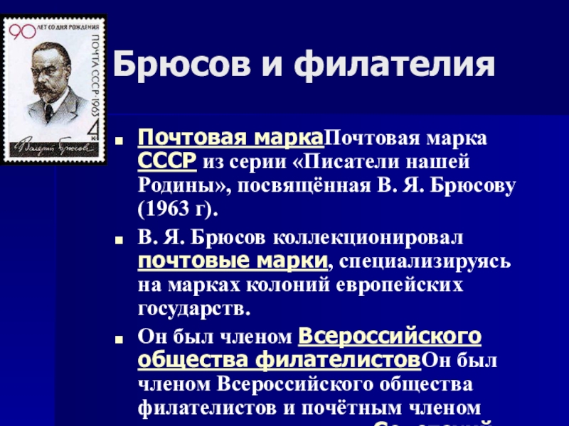 В. Я. Брюсов коллекционировал почтовые марки, специализируясь на марках колоний европейских государств.
