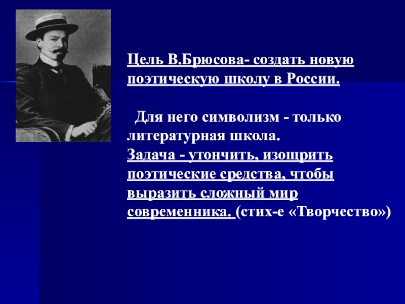 Слайд 4Цель В.Брюсова- создать новую поэтическую школу в России.
