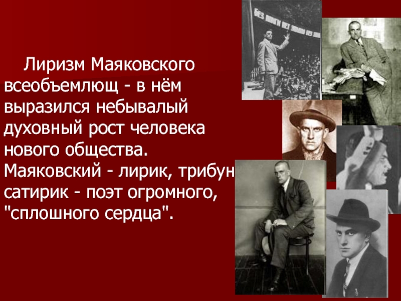 Слайд 18 Лиризм Маяковского всеобъемлющ - в нём выразился небывалый духовный рост человека