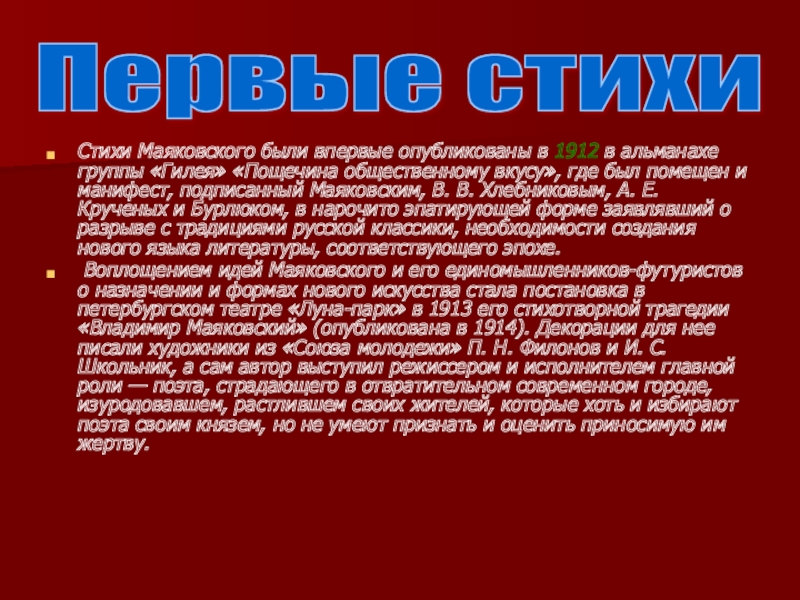 Стихи Маяковского были впервые опубликованы в 1912 в альманахе группы «Гилея»