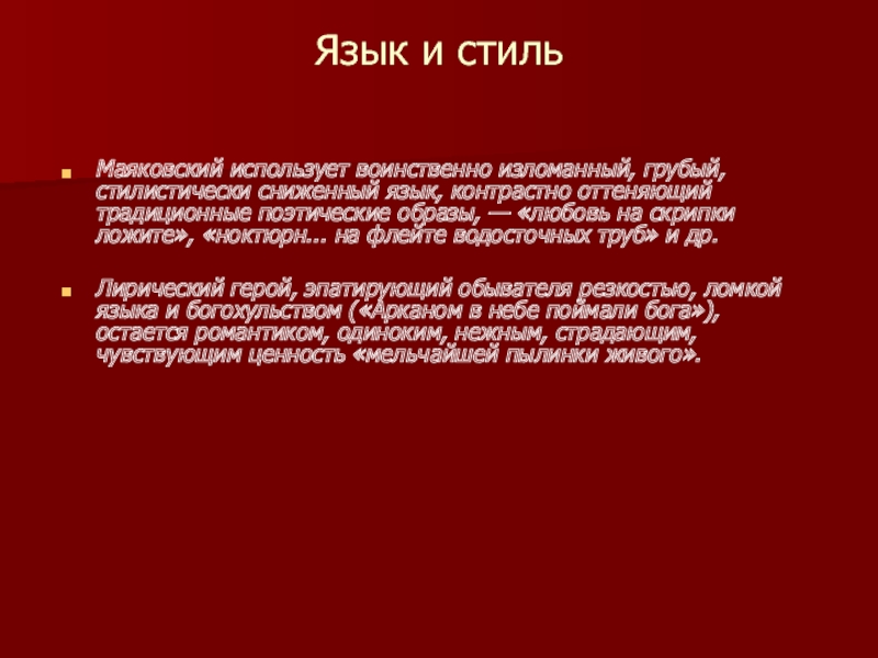 Маяковский использует воинственно изломанный, грубый, стилистически сниженный язык, контрастно