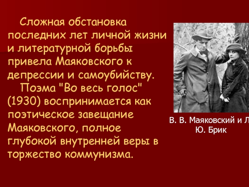 к депрессии и самоубийству. Поэма "Во весь голос" (1930) воспринимается как поэтическое завещание Маяковского, полное глубокой внутренней веры в торжество коммунизма.