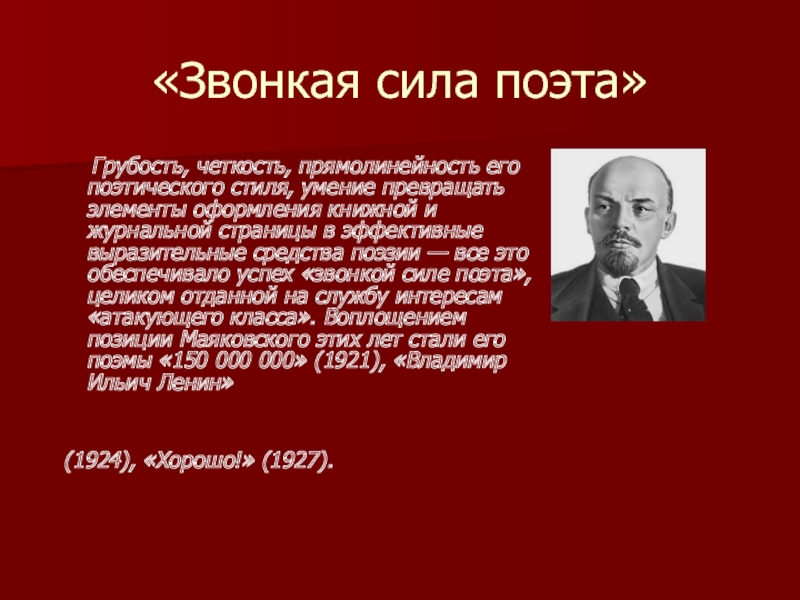 умение превращать элементы оформления книжной и журнальной страницы в эффективные выразительные средства поэзии — все это обеспечивало успех «звонкой силе поэта», целиком отданной на службу интересам «атакующего класса». Воплощением позиции Маяковского этих лет стали его поэмы «150 000 000» (1921), «Владимир Ильич Ленин»