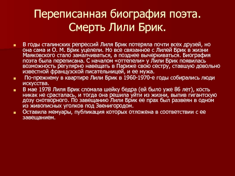 Слайд 31Переписанная биография поэта. Смерть Лили Брик.