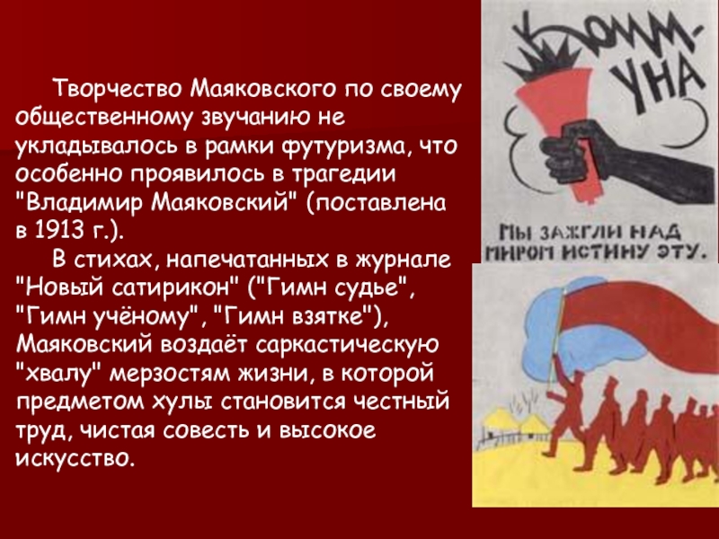 Слайд 5 Творчество Маяковского по своему общественному звучанию не укладывалось в рамки футуризма,