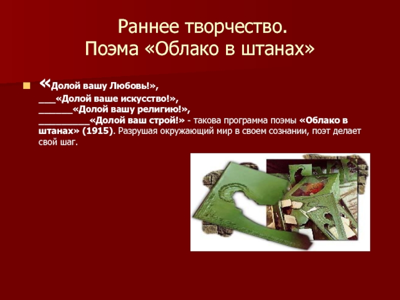 _________«Долой ваш строй!» - такова программа поэмы «Облако в штанах» (1915). Разрушая окружающий мир в своем сознании, поэт делает свой шаг.