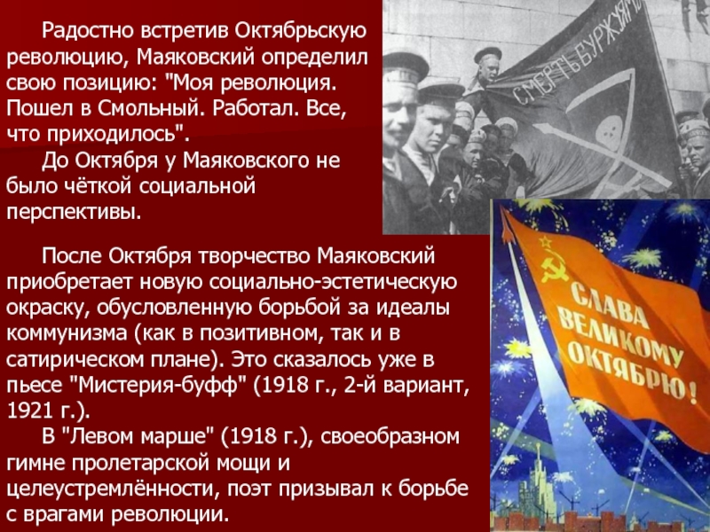 После Октября творчество Маяковский приобретает новую социально-эстетическую окраску, обусловленную борьбой за идеалы коммунизма (как в позитивном, так и в сатирическом плане). Это сказалось уже в пьесе "Мистерия-буфф" (1918 г., 2-й вариант, 1921 г.).