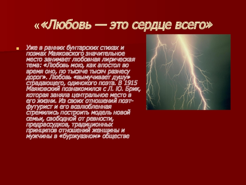 Маяковского значительное место занимает любовная лирическая тема: «Любовь мою, как апостол во время оно, по тысяче тысяч разнесу дорог». Любовь «вымучивает душу» страдающего, одинокого поэта. В 1915 Маяковский познакомился с Л. Ю. Брик, которая заняла центральное место в его жизни. Из своих отношений поэт-футурист и его возлюбленная стремились построить модель новой семьи, свободной от ревности, предрассудков, традиционных принципов отношений женщины и мужчины в «буржуазном» обществе