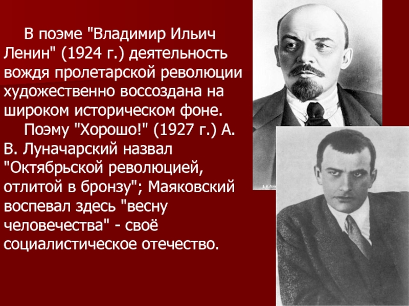 Поэму "Хорошо!" (1927 г.) А. В. Луначарский назвал "Октябрьской революцией, отлитой в бронзу"; Маяковский воспевал здесь "весну человечества" - своё социалистическое отечество.