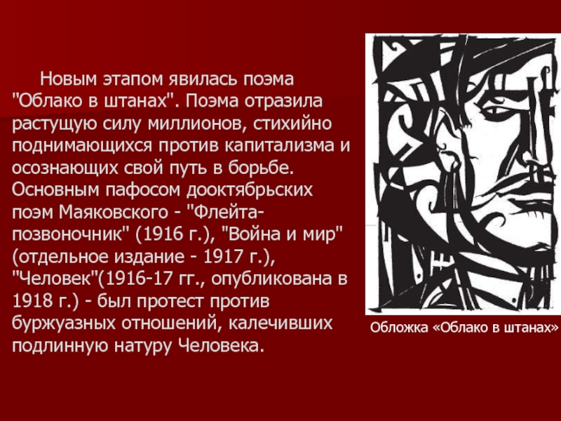 Слайд 8 Новым этапом явилась поэма "Облако в штанах". Поэма отразила растущую силу