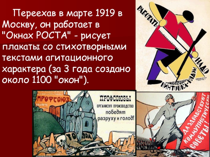 Слайд 15 Переехав в марте 1919 в Москву, он работает в "Окнах РОСТА"