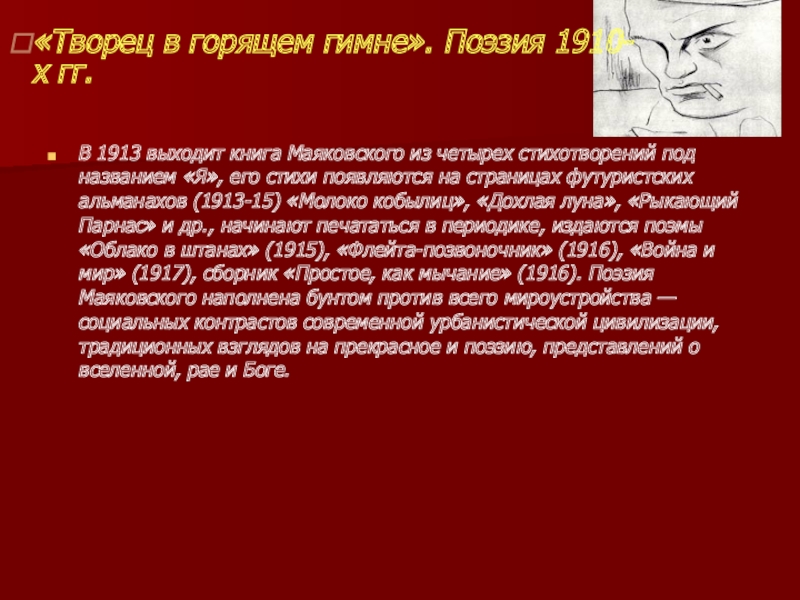 его стихи появляются на страницах футуристских альманахов (1913-15) «Молоко кобылиц», «Дохлая луна», «Рыкающий Парнас» и др., начинают печататься в периодике, издаются поэмы «Облако в штанах» (1915), «Флейта-позвоночник» (1916), «Война и мир» (1917), сборник «Простое, как мычание» (1916). Поэзия Маяковского наполнена бунтом против всего мироустройства — социальных контрастов современной урбанистической цивилизации, традиционных взглядов на прекрасное и поэзию, представлений о вселенной, рае и Боге.