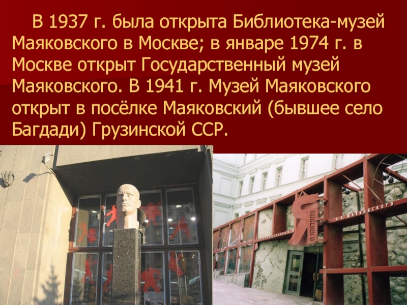 Слайд 22 В 1937 г. была открыта Библиотека-музей Маяковского в Москве; в январе