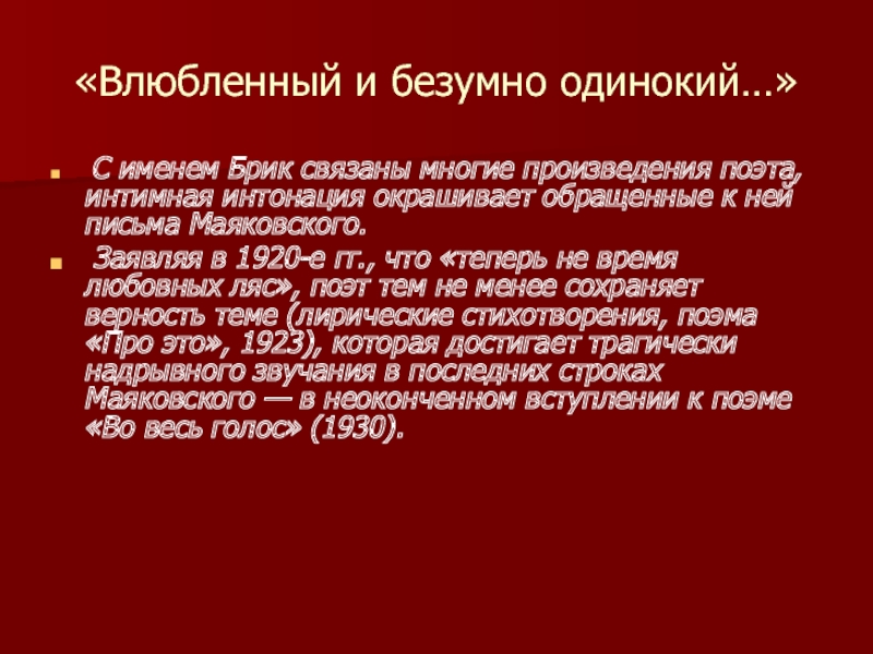 Заявляя в 1920-е гг., что «теперь не время любовных ляс», поэт тем не менее сохраняет верность теме (лирические стихотворения, поэма «Про это», 1923), которая достигает трагически надрывного звучания в последних строках Маяковского — в неоконченном вступлении к поэме «Во весь голос» (1930).