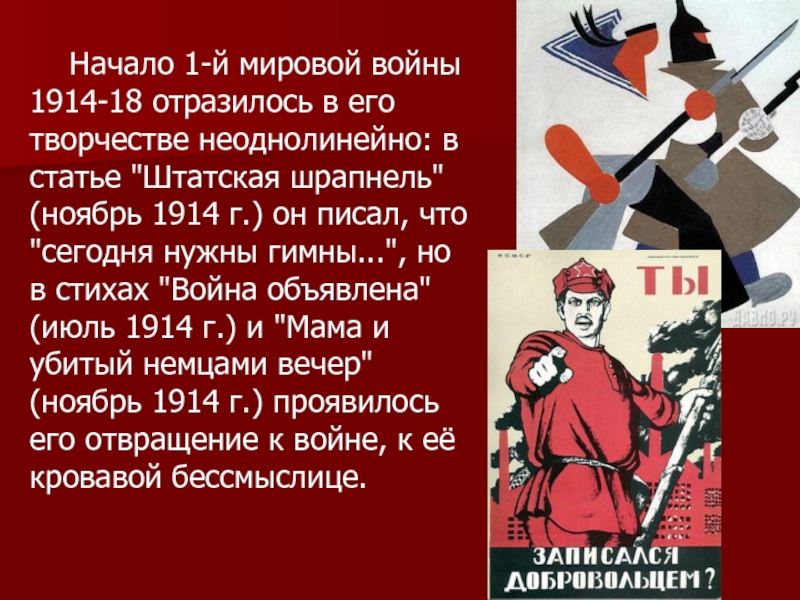статье "Штатская шрапнель" (ноябрь 1914 г.) он писал, что "сегодня нужны гимны...", но в стихах "Война объявлена" (июль 1914 г.) и "Мама и убитый немцами вечер" (ноябрь 1914 г.) проявилось его отвращение к войне, к её кровавой бессмыслице.