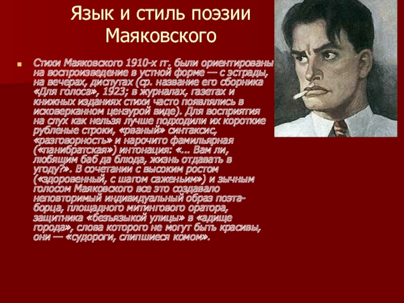 воспроизведение в устной форме — с эстрады, на вечерах, диспутах (ср. название его сборника «Для голоса», 1923; в журналах, газетах и книжных изданиях стихи часто появлялись в исковерканном цензурой виде). Для восприятия на слух как нельзя лучше подходили их короткие рубленые строки, «рваный» синтаксис, «разговорность» и нарочито фамильярная («панибратская») интонация: «... Вам ли, любящим баб да блюда, жизнь отдавать в угоду?». В сочетании с высоким ростом («здоровенный, с шагом саженьим») и зычным голосом Маяковского все это создавало неповторимый индивидуальный образ поэта-борца, площадного митингового оратора, защитника «безъязыкой улицы» в «адище города», слова которого не могут быть красивы, они — «судороги, слипшиеся комом».