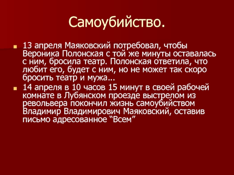 14 апреля в 10 часов 15 минут в своей рабочей комнате в Лубянском проезде выстрелом из револьвера покончил жизнь самоубийством Владимир Владимирович Маяковский, оставив письмо адресованное “Всем”