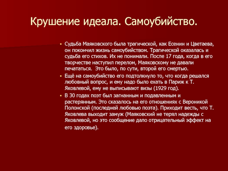 покончил жизнь самоубийством. Трагической оказалась и судьба его стихов. Их не понимали. После 17 года, когда в его творчестве наступил перелом, Маяковскому не давали печататься. Это было, по сути, второй его смертью.