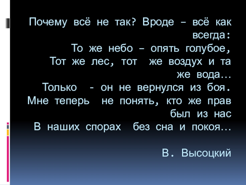 – опять голубое, Тот же лес, тот же воздух и та же вода… Только - он не вернулся из боя. Мне теперь не понять, кто же прав был из нас В наших спорах без сна и покоя… В. Высоцкий