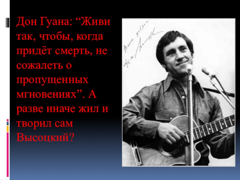 Дон Гуана: “Живи так, чтобы, когда придёт смерть, не сожалеть о пропущенных мгновениях”. А разве иначе жил и творил сам Высоцкий?