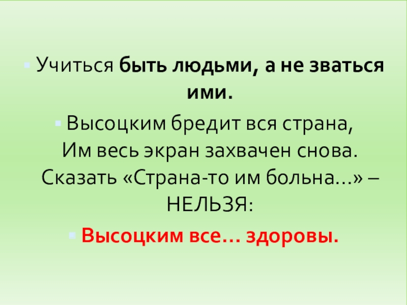 Учиться быть людьми, а не зваться ими.Высоцким бредит вся страна, Им весь экран захвачен снова. Сказать «Страна-то им
