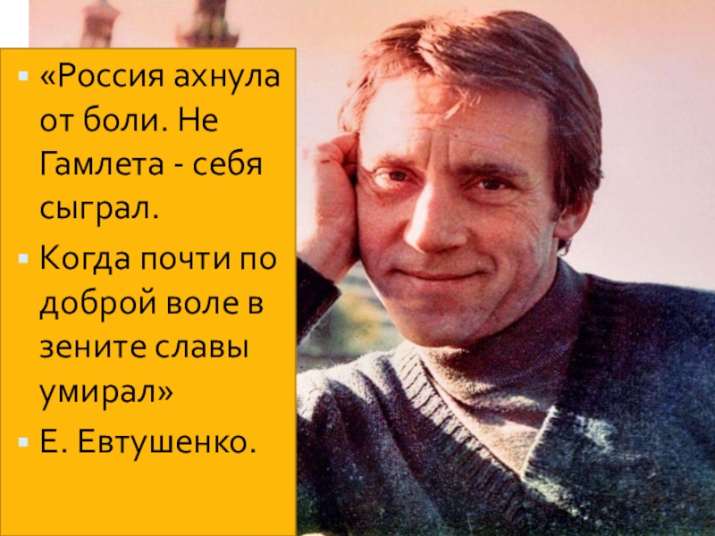 «Россия ахнула от боли. Не Гамлета - себя сыграл.Когда почти по доброй воле в зените славы умирал»Е.
