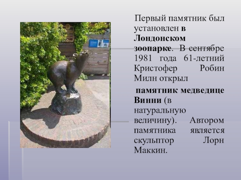 Слайд 21 Первый памятник был установлен в Лондонском зоопарке. В сентябре 1981