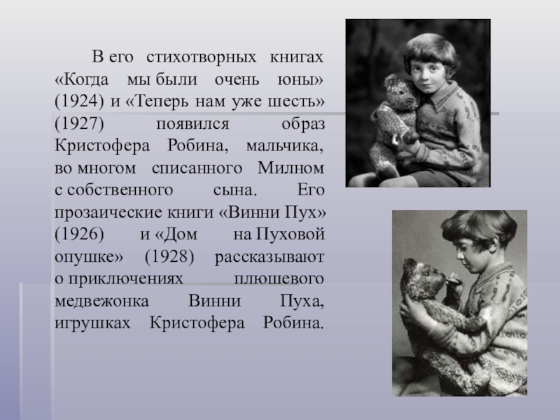 и «Теперь нам уже шесть» (1927) появился образ Кристофера Робина, мальчика, во многом списанного Милном с собственного сына. Его прозаические книги «Винни Пух» (1926) и «Дом на Пуховой опушке» (1928) рассказывают о приключениях плюшевого медвежонка Винни Пуха, игрушках Кристофера Робина.