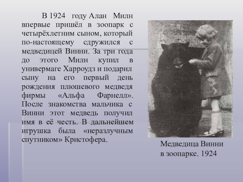 Слайд 7 В 1924 году Алан Милн впервые пришёл в зоопарк с