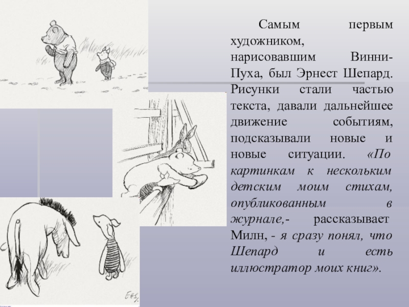 стали частью текста, давали дальнейшее движение событиям, подсказывали новые и новые ситуации. «По картинкам к нескольким детским моим стихам, опубликованным в журнале,- рассказывает Милн, - я сразу понял, что Шепард и есть иллюстратор моих книг».
