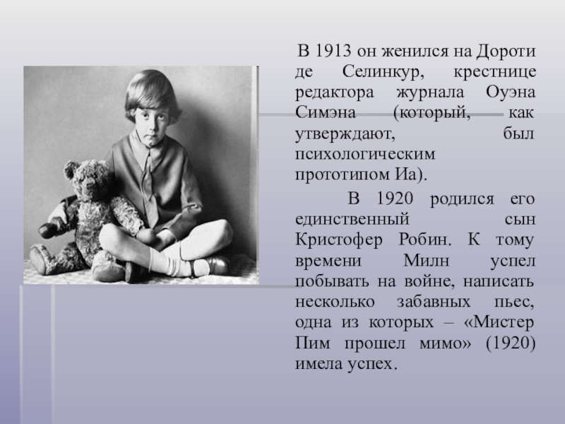 В 1920 родился его единственный сын Кристофер Робин. К тому времени Милн успел побывать на войне, написать несколько забавных пьес, одна из которых – «Мистер Пим прошел мимо» (1920) имела успех.